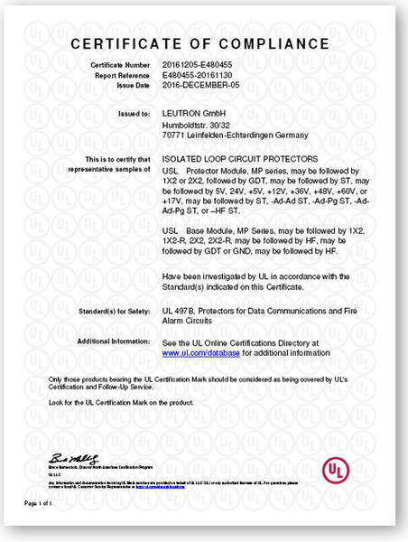 Ab sofort besitzen unsere MSR- Ableiter der MP- Serie Das UL Listed-Prüfzeichen. Das UL Prüfzeichen steht für die nachgewiesene Konformität eines Produkts mit den Sicherheitsbestimmungen der USA und Kanadas.' Kein anderes Prüfzeichen hat für diese Märkte einen vergleichbaren Stellenwert. Das UL Prüfzeichen gilt als Nachweis, dass eine repräsentative Anzahl unserer MP- Ableiter durch UL geprüft wurde und dabei die geltenden Standards oder andere Anforderungen hinsichtlich eines potentiellen Risikos von Feuer, elektrischem Schock und mechanischer Gefahr erfüllt wurden. Mit dem UL Prüfzeichen auf einem Produkt gibt der Hersteller an, die geltenden Standards fortwährend einzuhalten. Alle Leutron MSR- Ableiter der steckbaren MP- Familie erfüllen die Norm (en) für Sicherheit UL 497B, Schutzvorrichtungen für Datenkommunikation und Brandmeldeanlagen.